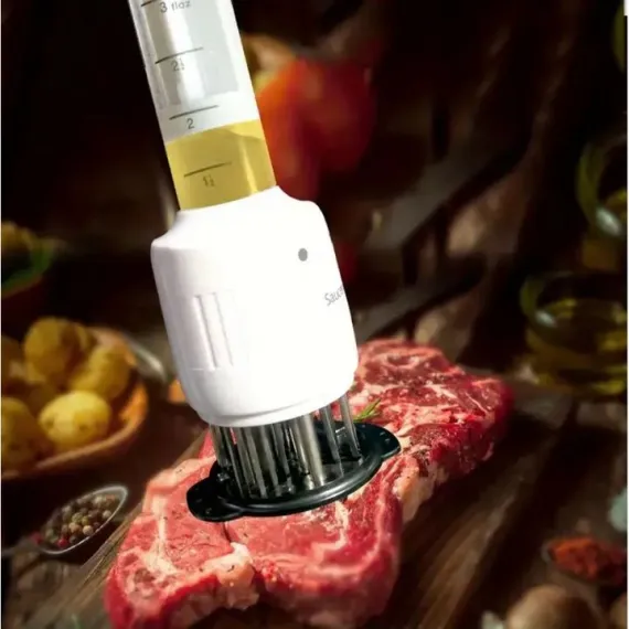 Fragezitor de carne cu injector sos, 2 trepte. Prepara fripturi delicioase ca un adevarat bucatar sef. Noul aparat de injectat sosul preferat dar si de fragezit va deveni aliatul tau in bucatarie.
