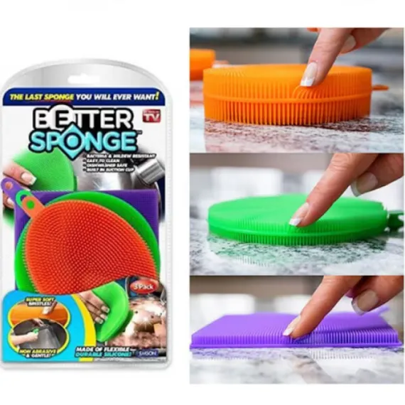 Va prezentam buretele din silicon Ultimate Sponge Set pentru spalare Bureti antibacterieni multifunctionali din silicon pentru spalarea vaselor si a vaselor. Cu ele poti sa speli fructe si legume si sa-ti faci viata mai usoara in bucatarie! Sunt bureti pentru murdaria incapatanata si manerul pentru curatarea fructelor sau legumelor cu design ergonomic si practic intr-unul, peria este potrivita pentru curatarea grasimilor incapatanate, oalelor arse, fructelor sau legumelor proaspete, cartofilor, ciupercilor, morcovilor etc. Buretii sunt foarte moi si placuti la atingere, curata chiar si cea mai incapatanata murdarie. Poate fi folosit pe ambele parti. Pot fi folosite pentru spalat sau pentru transportul vaselor fierbinti. Forma confortabila si ergonomica urmeaza forma palmei mainii. Ciupercile au un design interesant, distractiv, in 3 forme – patrat, cerc si elipsa In plus, pot fi folosite pentru a deschide borcanele si a desuruba orice capace.