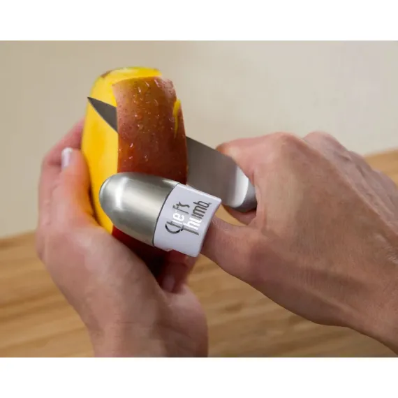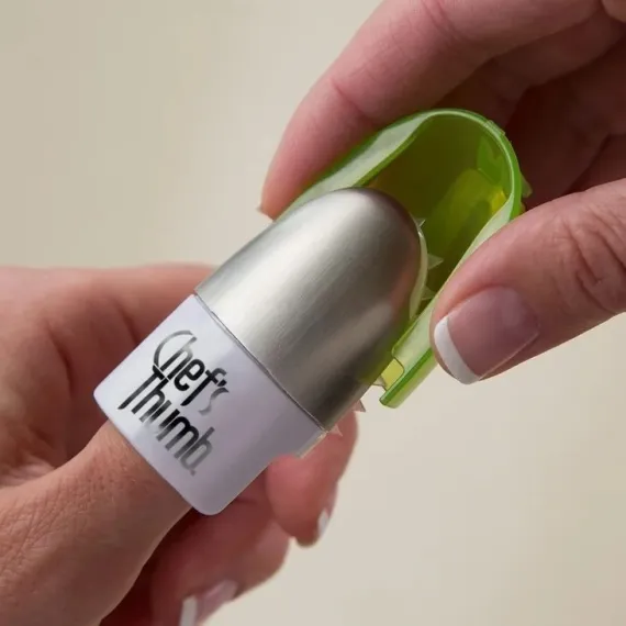 Chef’s Thumb® este cea mai recentă inovație în domeniul articolelor esențiale pentru bucătărie. Sistemul său Viper-Bite® a fost conceput științific pentru a prinde și stabiliza suprafața de tăiere, oferind în același timp protecție pentru degetul mare în cazul în care cuțitul alunecă. Are o formă ergonomică, iar designul său brevetat asigură o potrivire precisă pentru aproape orice dimensiune de deget mare.