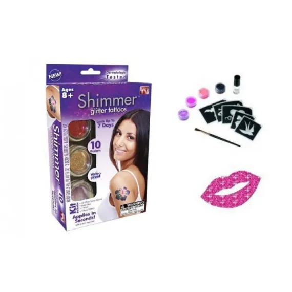 Kitul pentru tatuaje temporare cu sclipici Shimmer Glitter Tattoos va ajuta sa obtineti tatuaje simple cu sclipici si se aplica in cateva secunde. Setul contine 10 tatuaje colorate si atractive.