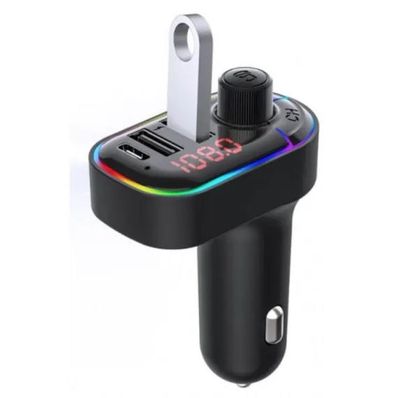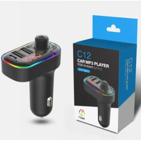 Modulator FM C12, Bluetooth 5.0, Transmitator FM cu functie de incarcator auto, Fast-Charge, 3 porturi de incarcare, Microfon extern, Afisaj Digital, Lumini RGB