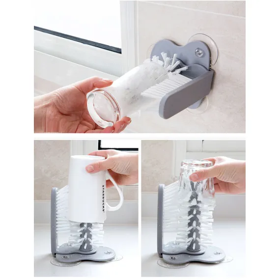 Perie dubla pentru spalare pahare, borcane si recipiente, fixare cu ventuza