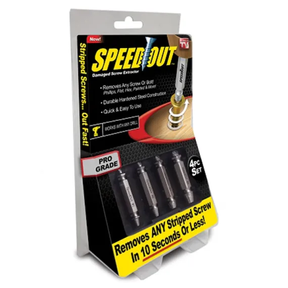 Specificatii Set 4 extractoare Speed out pentru suruburi rupte: Se potrivesc cu orice bormasina sau surubelnita electrica Inlatura orice surub blocat in mai putin de 10 secunde Rapid si usor de utilizat cu rezultate excelente Inlatura majoritatea suruburilor si niturilor Realizat din otel rezistent si durabil Varf cu auto-centrare Poate fi folosit la suruburile strambe, rupte, ruginite sau intepenite Functioneaza cu orice bormasina, si poate fi folosit la suruburile sau niturile de orice dimensiune Intrebuintari, lemn, metal, etc. Se poate folosi, poate fi folosit pentru suruburile cu cap drept, hex, Philips, imbusz, torx, XZN, ribe etc. Compatibil cu sistemul quick-connect al mandrinelor.