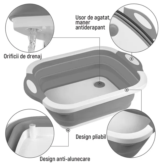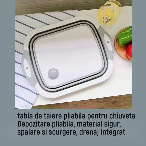 Chiuveta pliabila poate fi folosita pentru a spala vase, legume, fructe. Tabla de taiat pliabila poate fi folosita pentru a taia carne, legume si fructe, de asemenea, folosita ca un cos de depozitare pentru depozitarea diferitelor alimente si bauturi, ceea ce va economiseste bani, timp si spatiu.